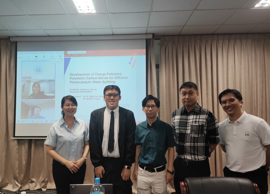 Joshua defended his Master dissertation "Development of Charge-Polarized Polymeric Carbon Nitride for Efficient Photocatalytic Water Splitting" or “电荷极化聚合碳氮化物的开发及其在高效光催化水分解中的应用” under the supervision of Asst. Prof. Dr. Braedan Foo Chuan Yi and Asst. Prof. Dr. Ng Boon Junn.