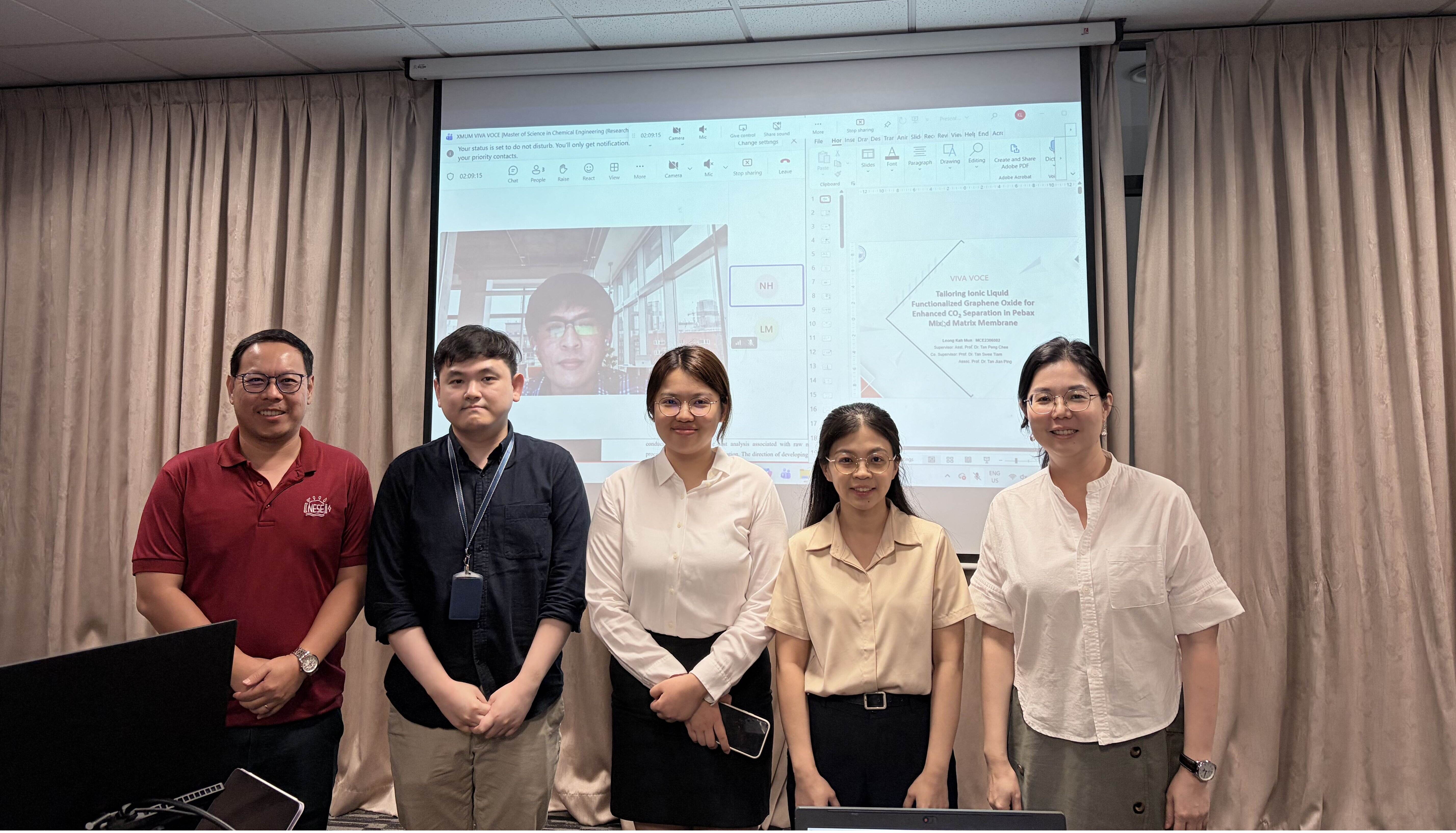 Leong Kah Mun defended her Master dissertation "Tailoring Ionic Liquid Functionalized Graphene Oxide for Enhanced CO₂ Separation in Pebax Mixed Matrix Membrane" or “调控离子液体功能化氧化石墨烯以提升混合基质膜的二氧化碳分离性能” under the supervision of Asst. Prof. Dr. Tan Peng Chee.