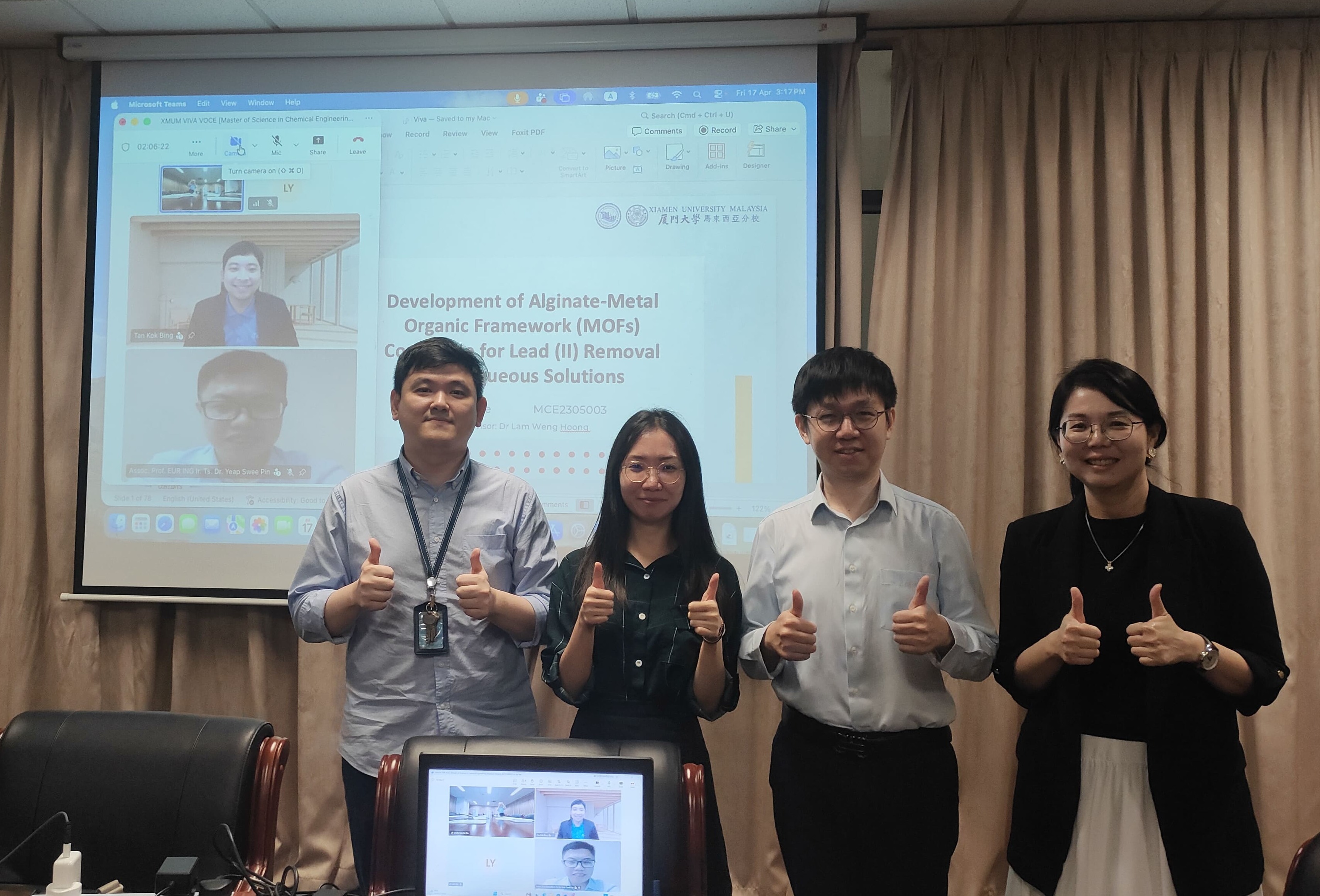 Lo Jay Yee defended her Master dissertation "Development of Alginate-Metal Organic Framework (MOFs) Composite for Lead (II) Removal from Aqueous Solutions" or “海藻酸盐/金属有机框架复合材料的构建及其对水中铅的吸附去除性能” under the supervision of Asst. Prof. Dr. Lam Weng Hoong.