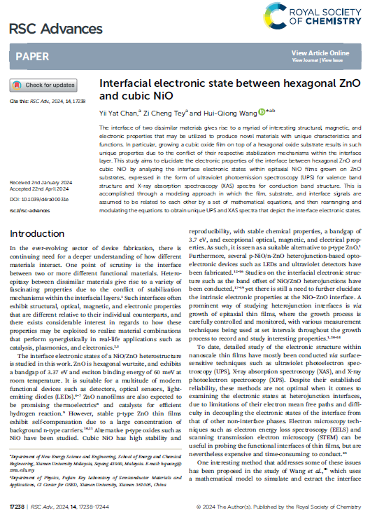 Chan defended his Master dissertation "Modeling of Interfacial Electronic States of an Epitaxially-Grown NiO/ZnO Heterostructure" or "外延生长的NiO/ZnO异质结的界面电子态建模研究" under the supervision of Prof. Dr. Wang Huiqiong. His work has been published in SCI-indexed journal: