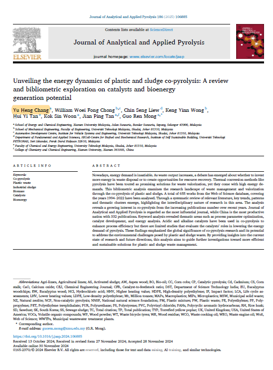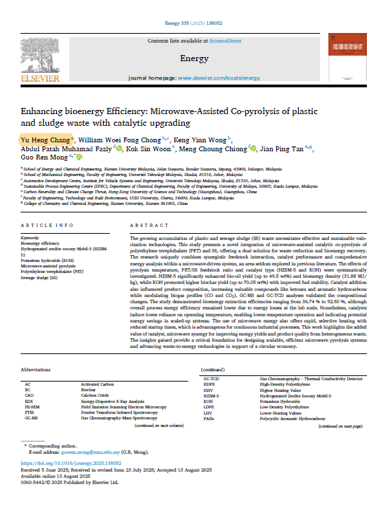 Yu Heng defended his Master dissertation "Catalytic Microwave Co-Pyrolysis of Plastic and Sludge Waste: Product Quantification, Characterization, Energy Analysis and Optimization Study" or "塑料和污泥废弃物的催化微波共热解:产物定量、表征、能量分析和优化研究" under the supervision of Asst Prof. Ir. Ts. Dr Mong Guo Ren. His work has been published in several SCI-indexed journals: