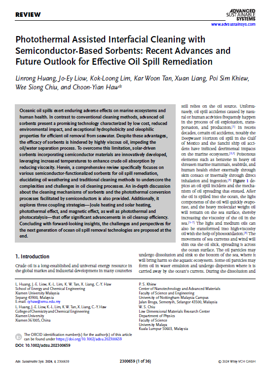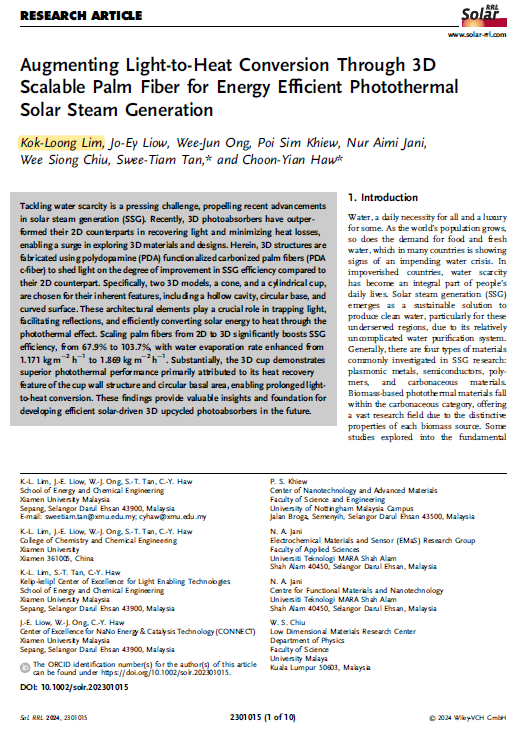 Lim defended his Master dissertation "Sustainable Solar Photothermal Applications for Environmental Remediation and Clean Water Production" or "可持续太阳能光热应用于环境修复与清洁水生产" under the supervision of Assoc. Prof. Dr. Haw Choon Yian & Assoc. Prof. Dr Tan Swee Tiam. His work has been published in several SCI-indexed journals: