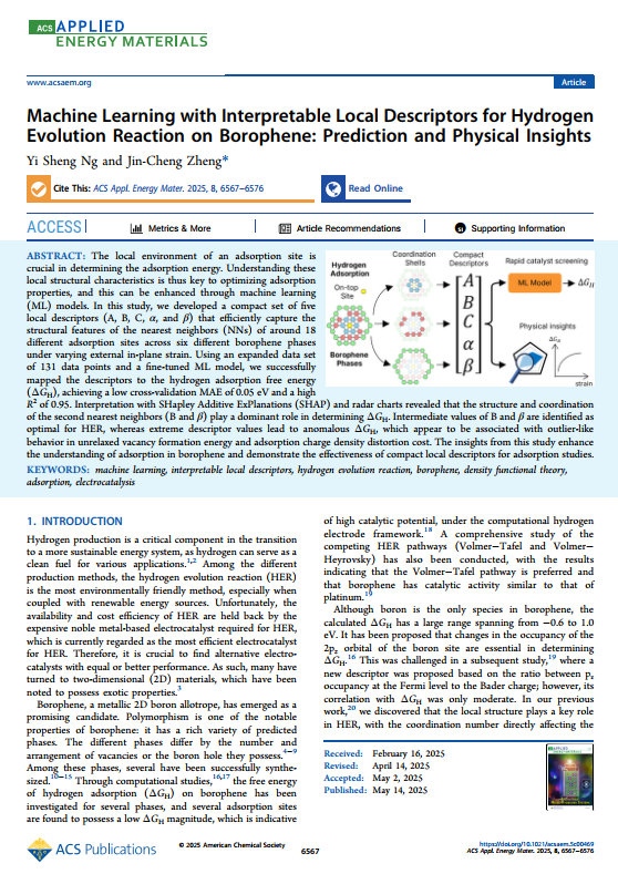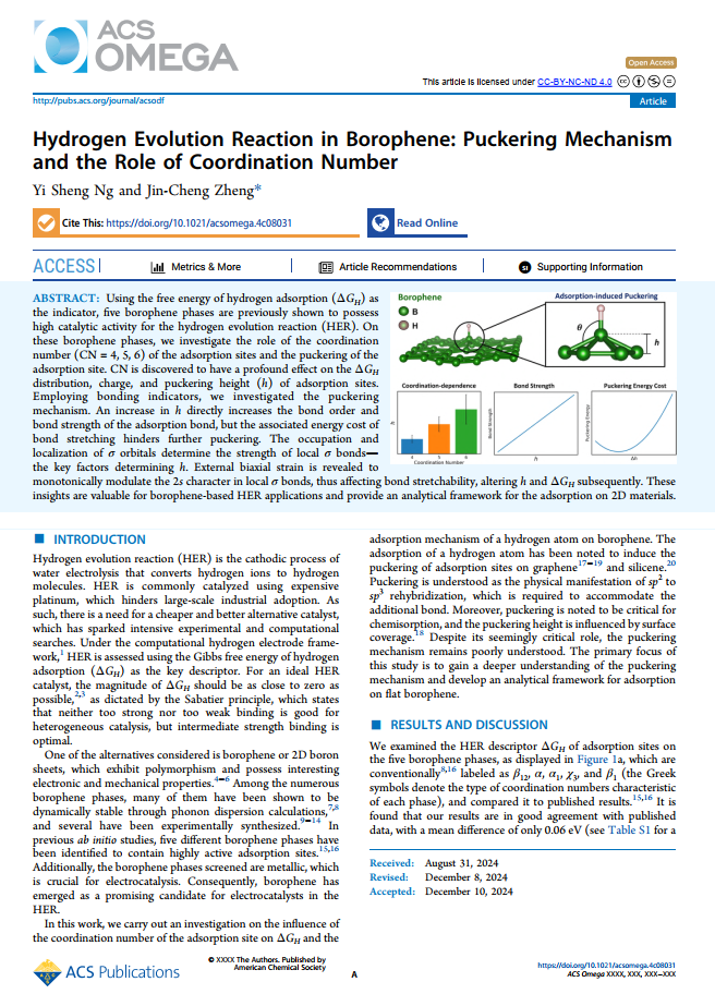 Ng defended his doctoral thesis "Study of Hydrogen Evolution Reaction Mechanisms and Descriptors on 2D Borophene and Honeycomb Materials: First-Principles Calculation and Descriptor Design" or "⼆维硼烯与蜂窝材料析氢反应机理与描述符的研究:第⼀性原理计算与描述符设计" under the supervision of Prof Dr. Zheng Jincheng and co-supervised by Prof Dr. Wang Huiqiong & Prof. Dr Ong Wee Jun. His work has been published in several SCI-indexed journal: